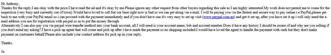 Scammers will usually state they are interstate or overseas, and are unable to view your item They are also unlikely to negotiate on price and will offer you the exact asking price, or may even offer to pay more than the asking price.